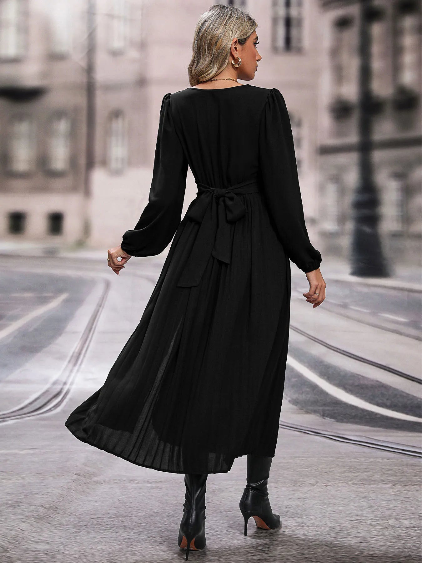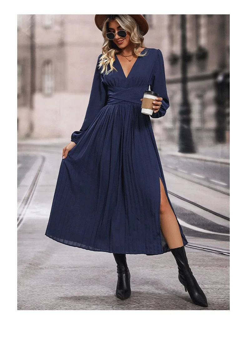 Solid Color V Neck Long Sleeve Midi Dress with Side Slit Waist Wrap